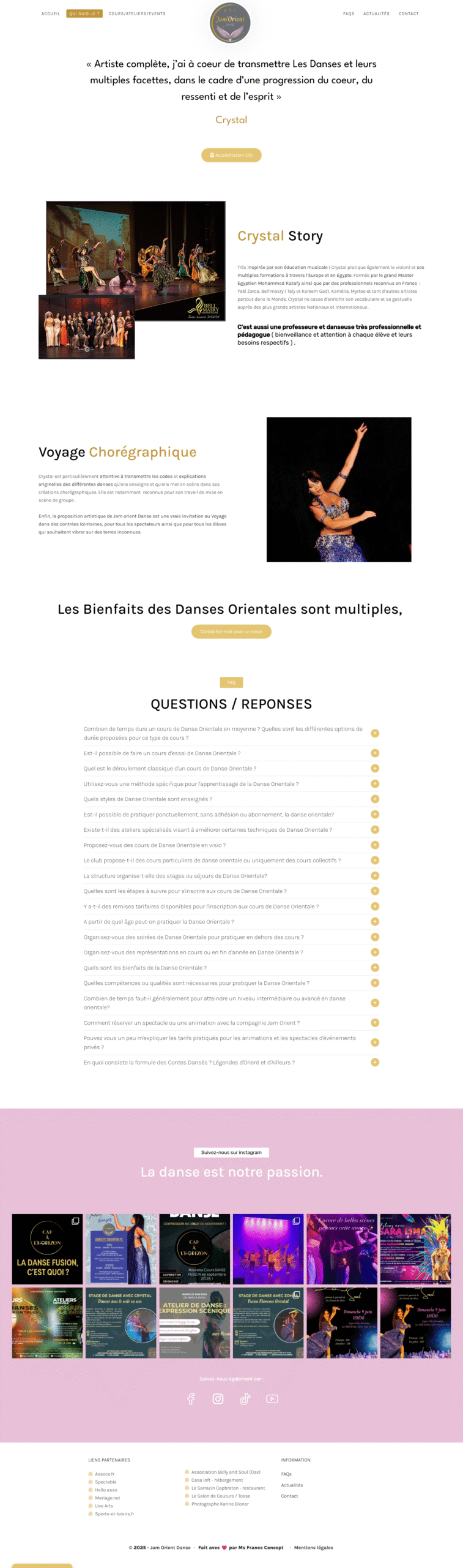 Résultat : un site vitrine moderne, expressif et performant, qui reflète parfaitement l’identité artistique et la passion de Crystal Jam Orient Danse.